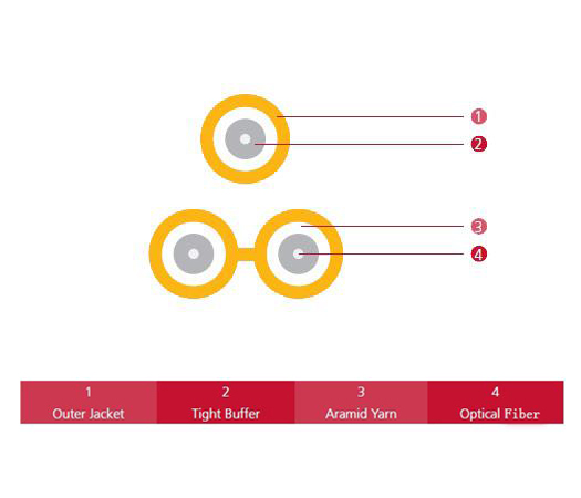 These optical fiber follows ITU specification and are colour coded as yellow (SM), orange (MM). The standard diameter is 3.0 mm. The specification meets UL (OFNR and OFNP) flame retardant rating.